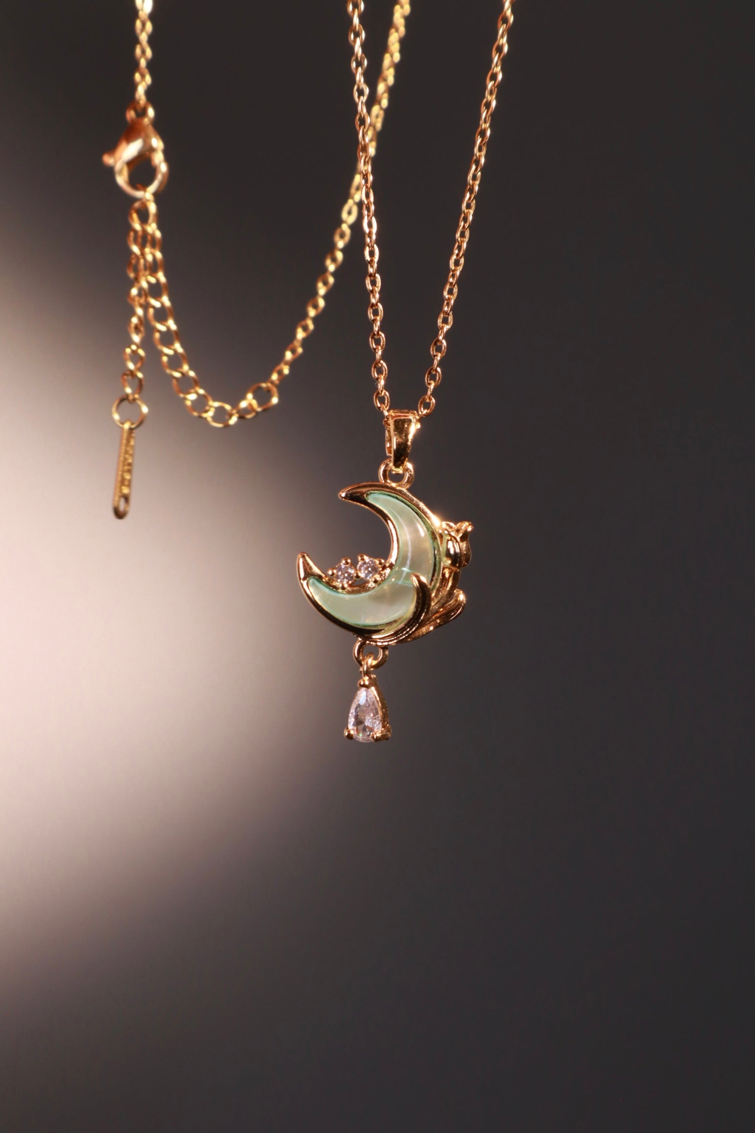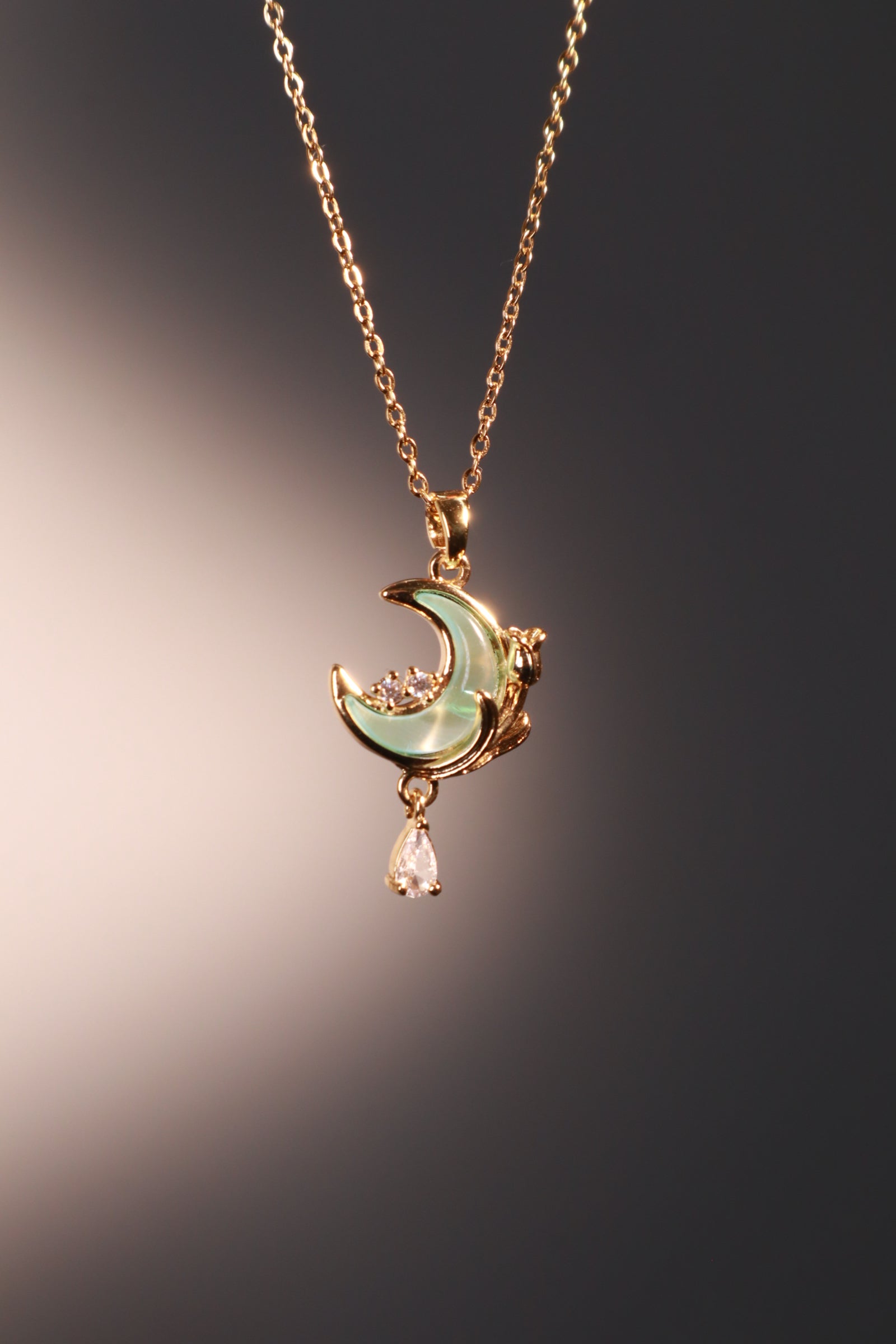 - 18K real gold plated over brass pendant + stainless steel chain + well-cut zirconia diamonds + zirconia blue moonstone
