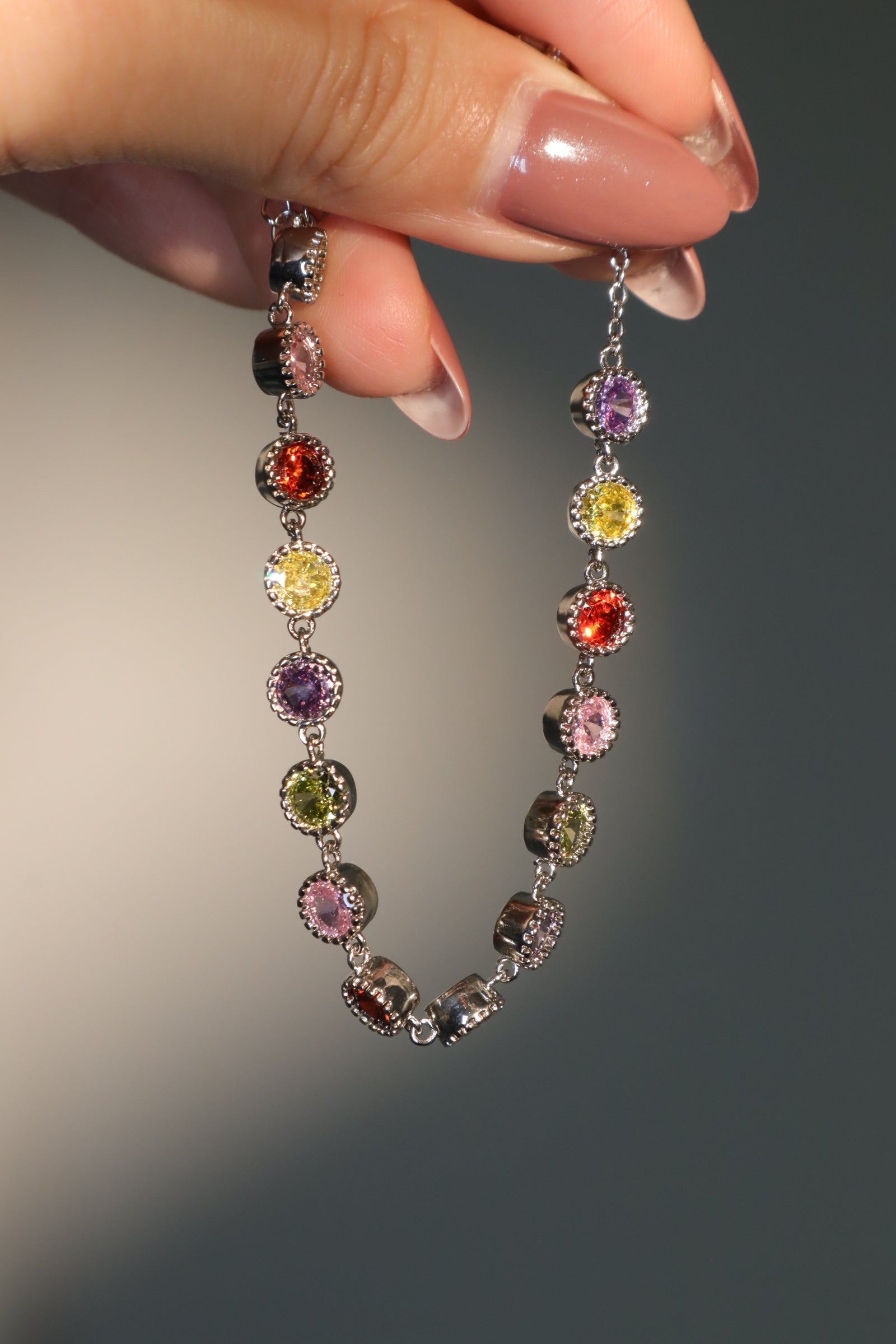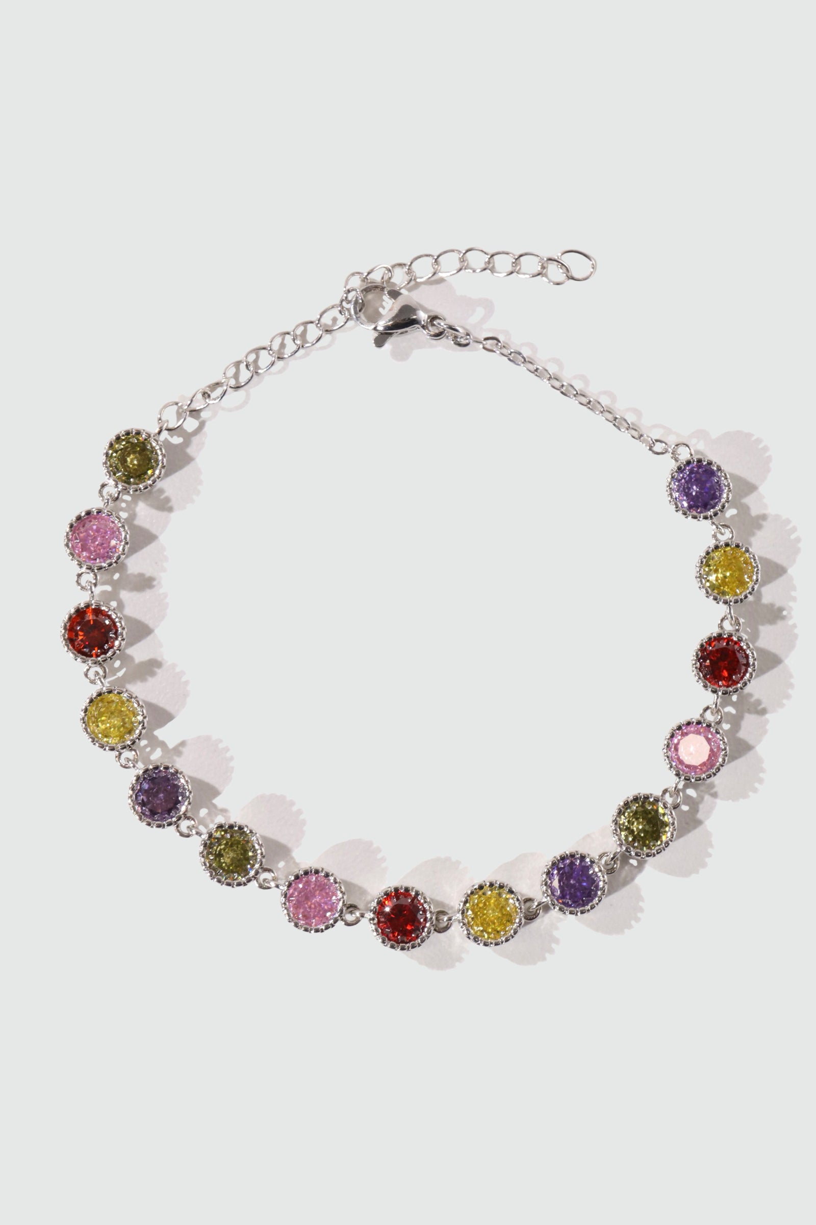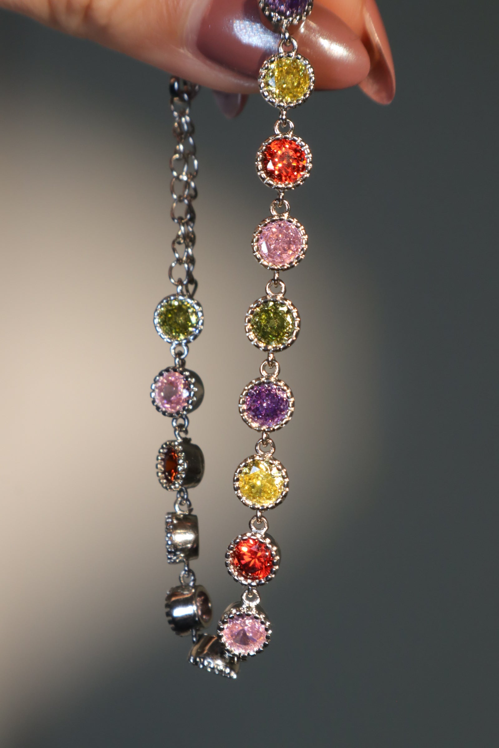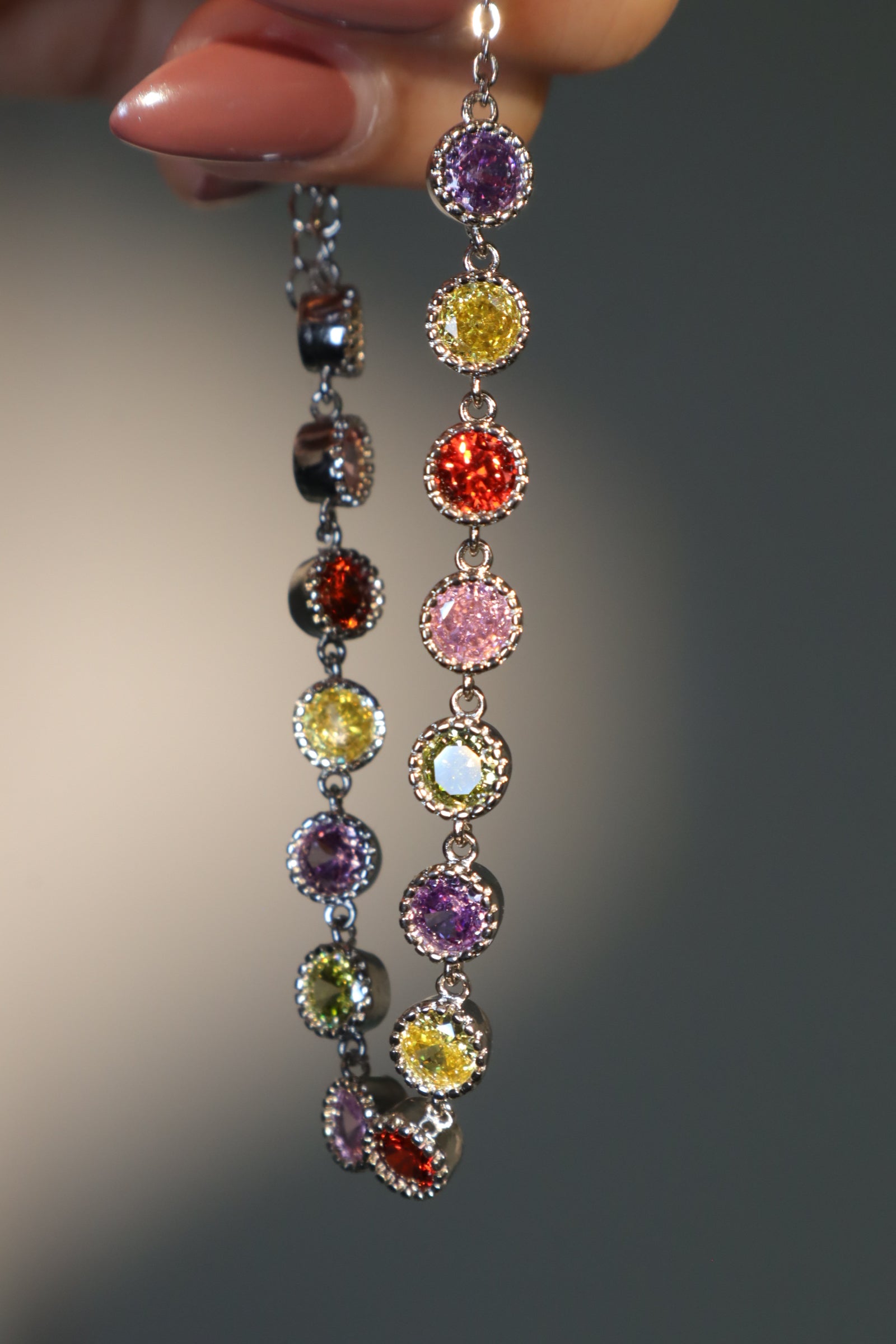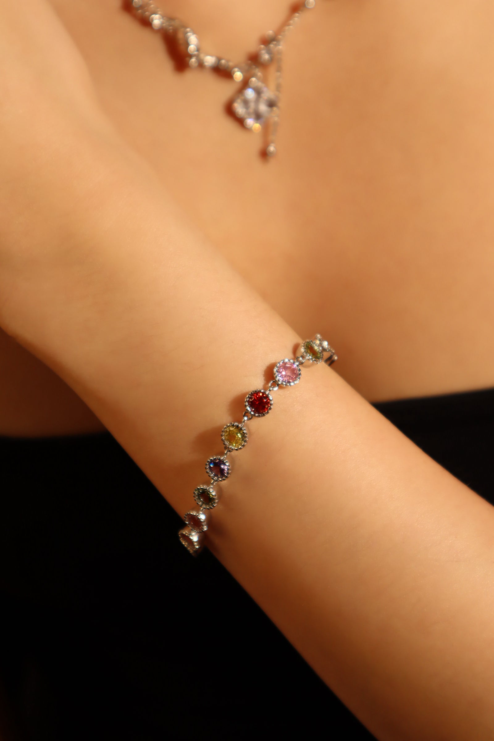 Flicker goodbye to dullness and stand out in our Multi Color Gemstones Bracelet. With the proper lighting, the zirconia color gemstones add a pop of shine to your ensemble. This unique bracelet makes your outfit stand out and is also a great gift for her or him.