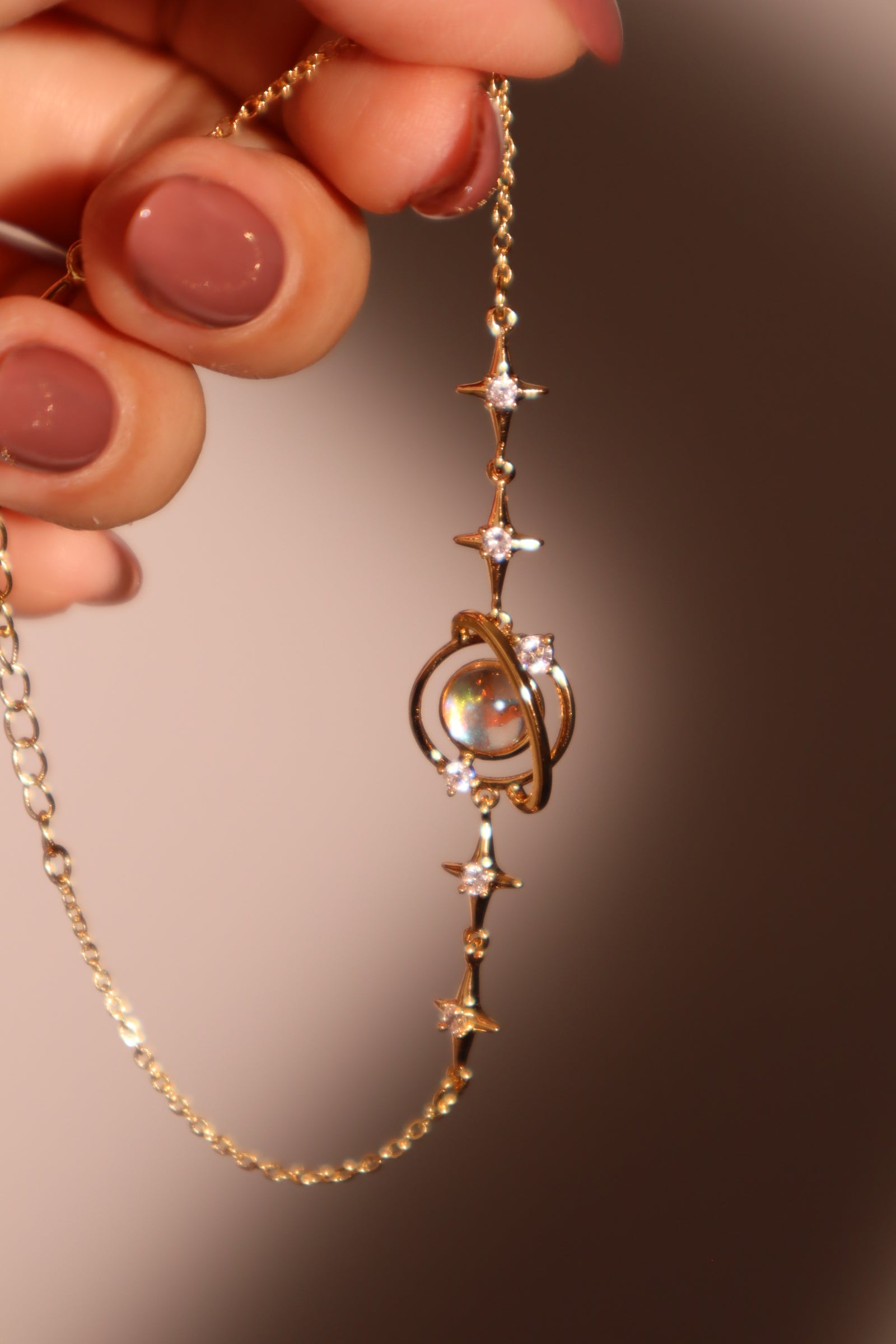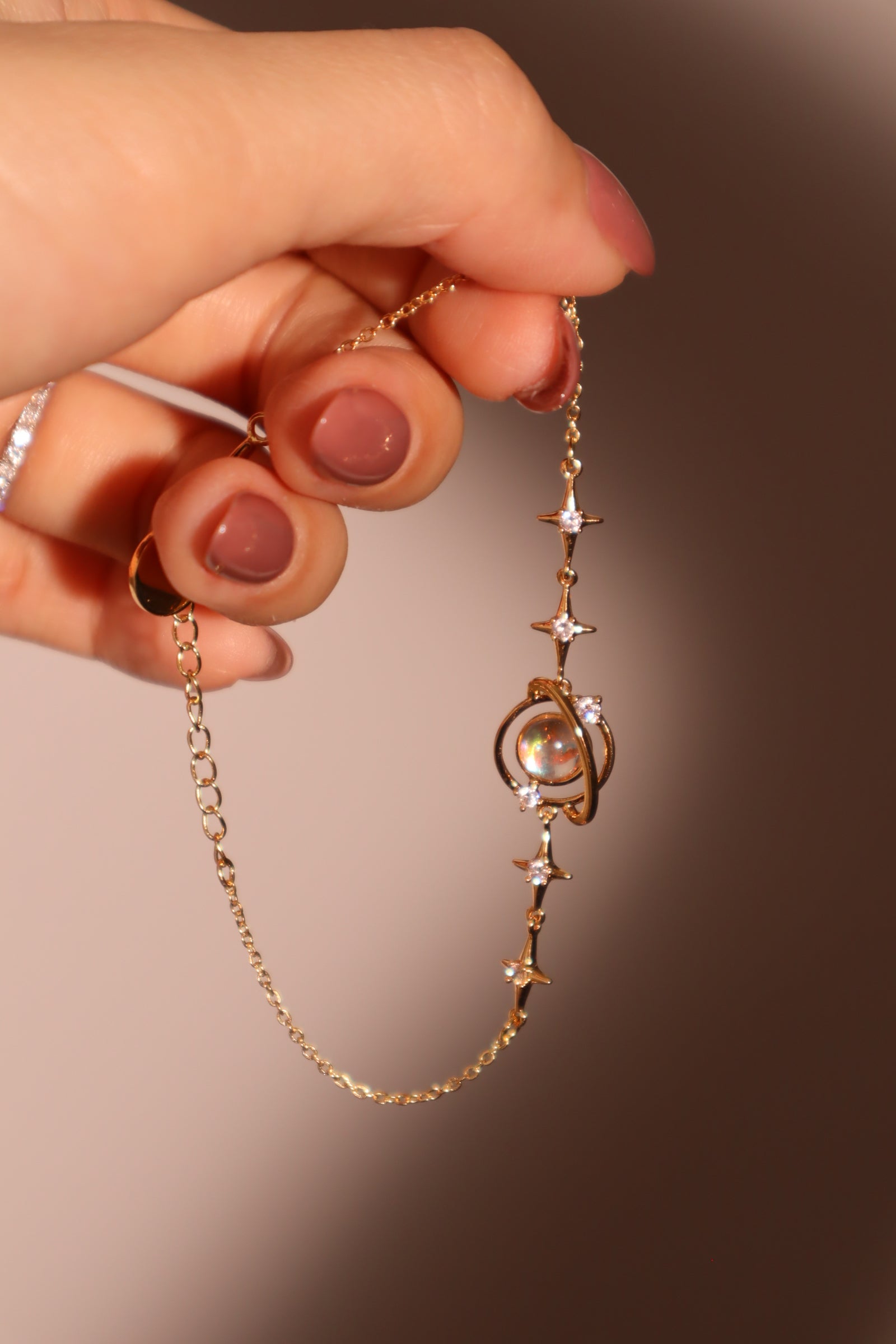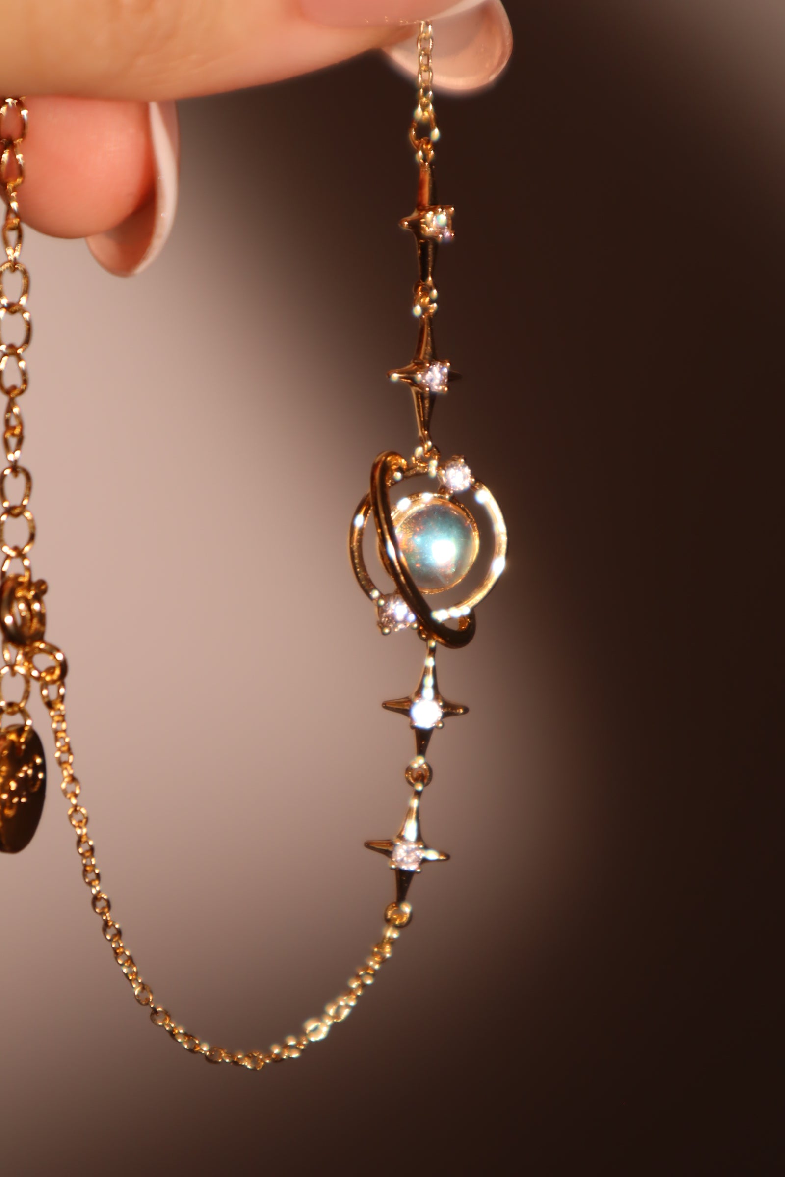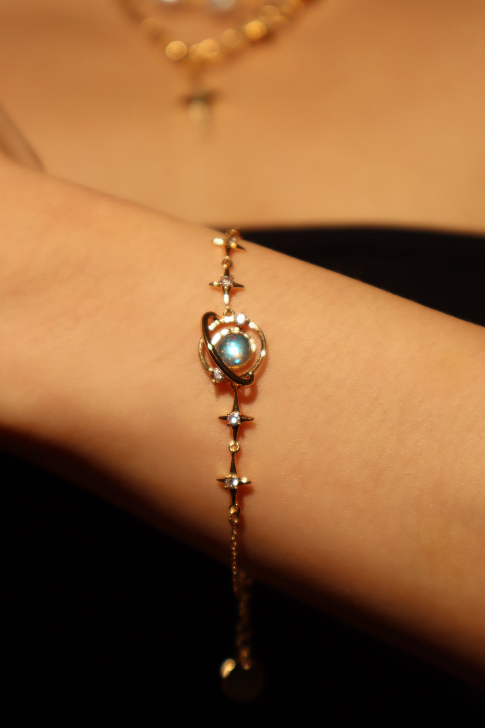 Flicker goodbye to dullness and stand out in our 18K Real Gold Plated Moonstone Saturn Star Bracelet. With the proper lighting, the zirconia moonstone adds a pop of shine to your ensemble. This unique bracelet makes your outfit stand out and is also a great gift for her or him.