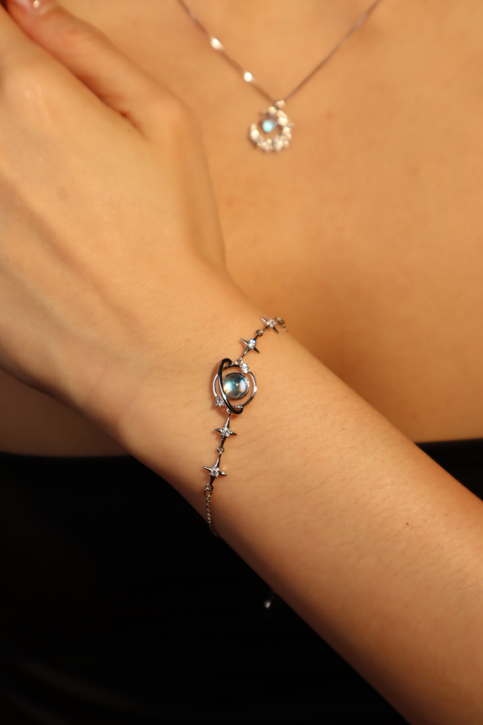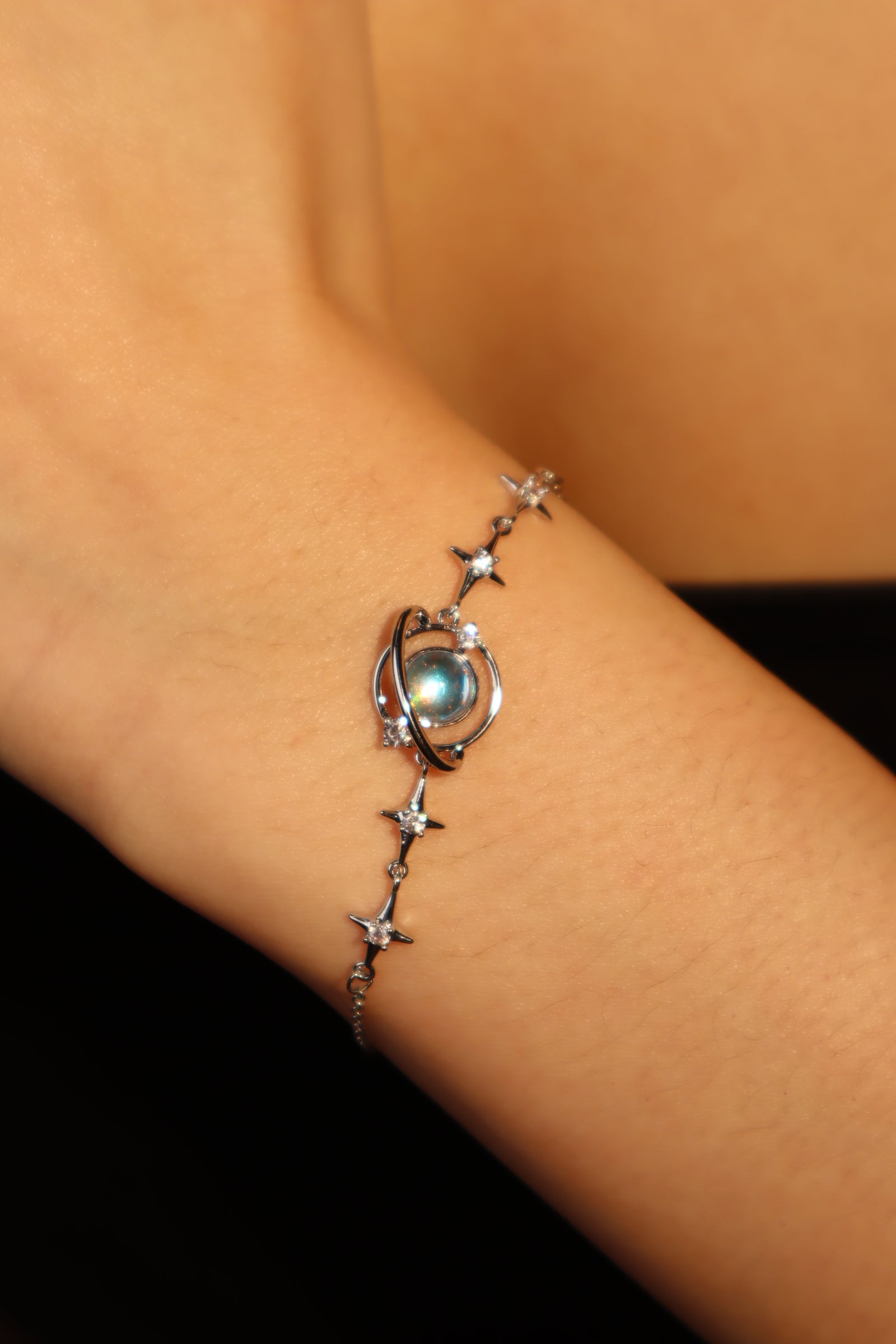 Flicker goodbye to dullness and stand out in our Platinum Plated Moonstone Saturn Star Bracelet. With the proper lighting, the zirconia moonstone adds a pop of shine to your ensemble. This unique bracelet makes your outfit stand out and is also a great gift for her or him.