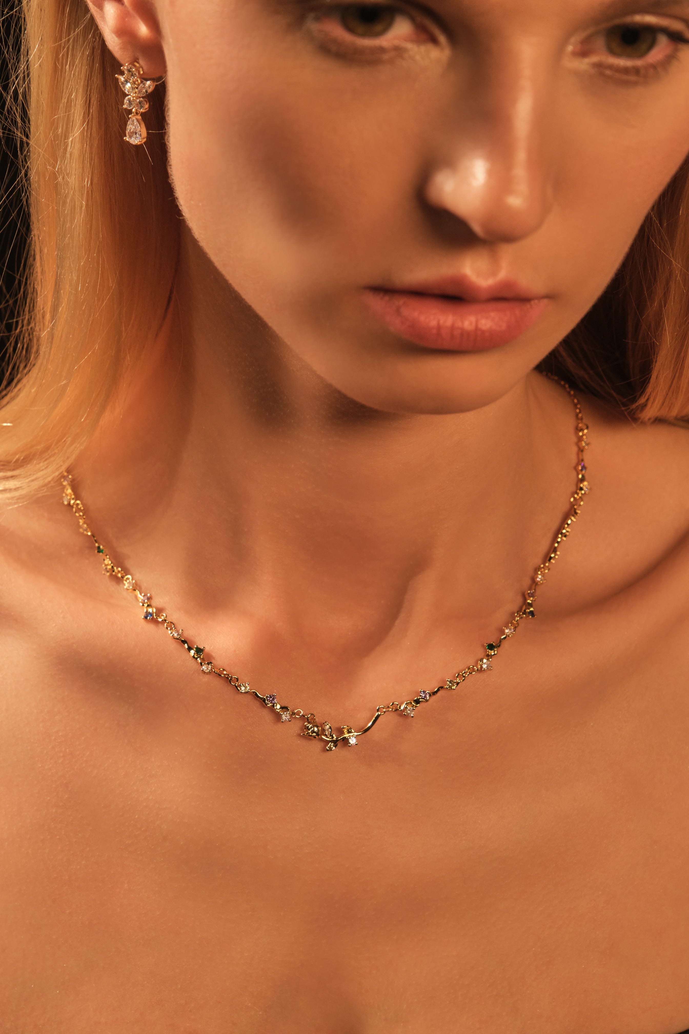 Flicker goodbye to dullness and stand out in our 18K Real Gold Plated Rose Garden Necklace. With the proper lighting, the zirconia color gemstones add a pop of shine to your ensemble. This unique necklace makes your outfit stand out and is also a great gift for her or him.
