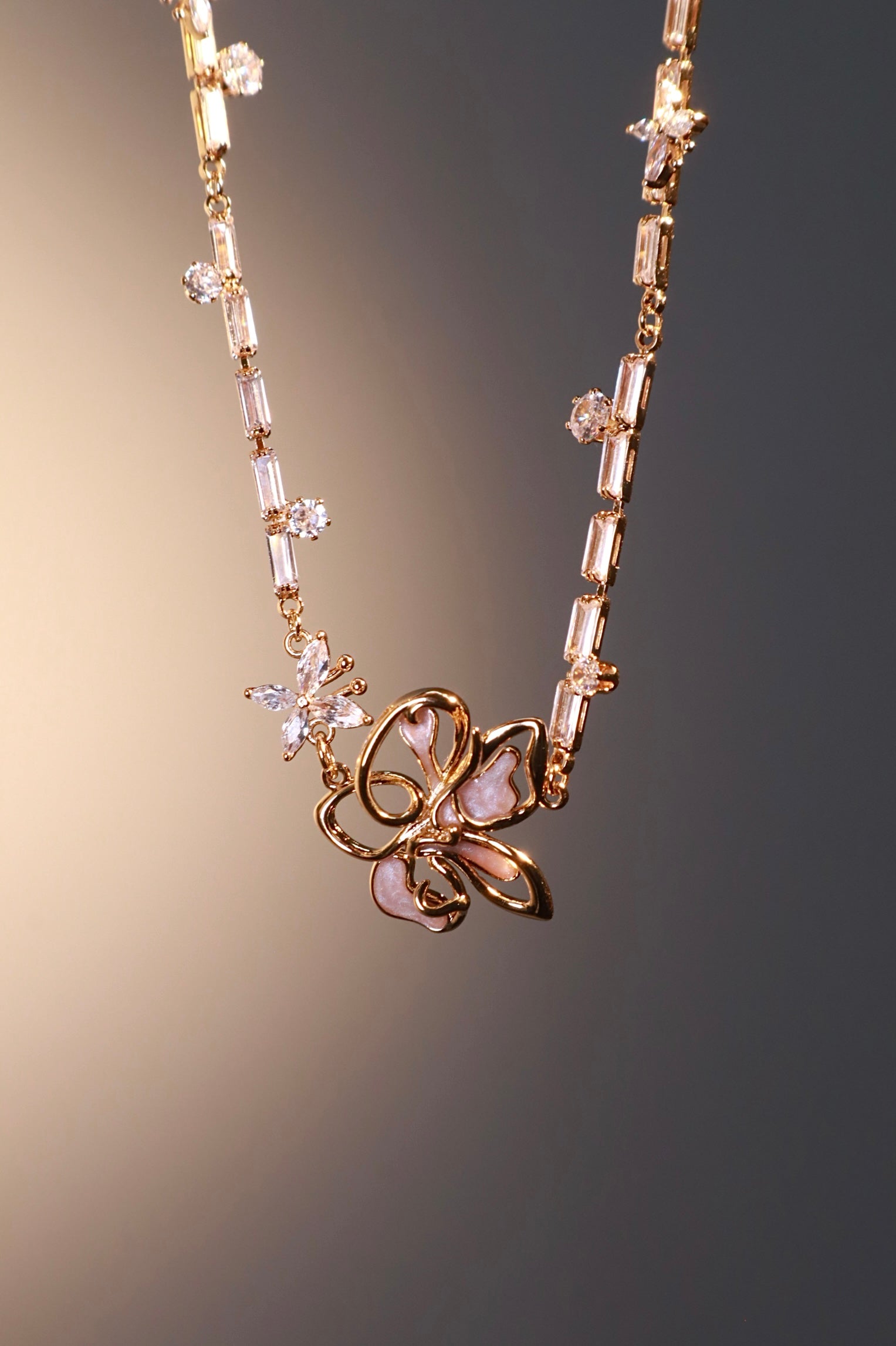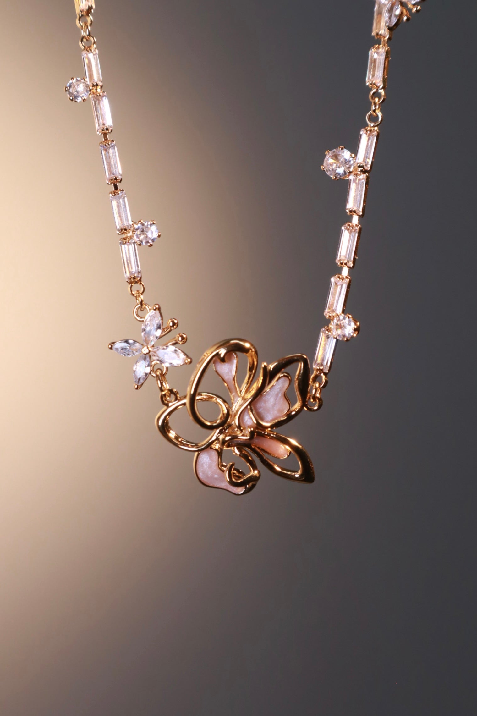 Flicker goodbye to dullness and stand out in our 18K Real Gold Plated Butterfly Pink Flower Necklace. With the proper lighting, the zirconia diamonds add a pop of shine to your ensemble. This unique necklace makes your outfit stand out and is also a great gift for her or him.